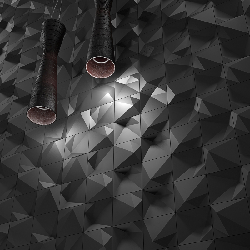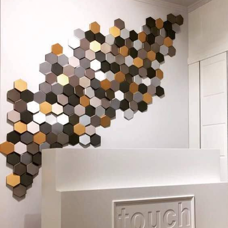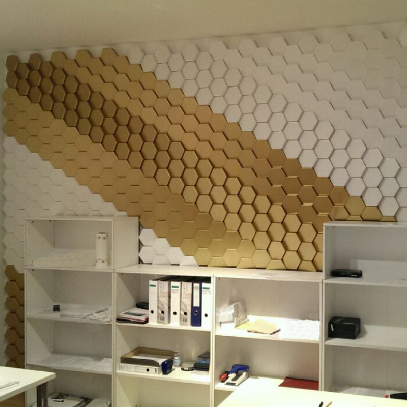 - ZETA three-dimensional hexagonal tiles, "ZETA" is an elegant version of the honeycomb pattern. Their angled faces lead to a nuanced symphony of shades and can be arranged to create subtle images and graphics.